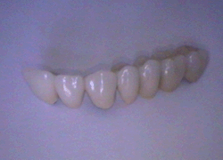 Sedemčlenný kovokeramický mostík nahrádza štyri stratené zuby - pohľad zospodu